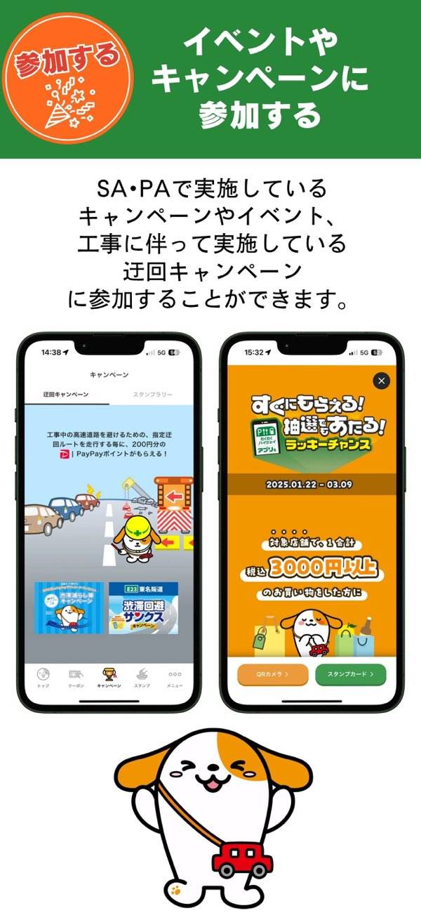 長距離ドライブ中の休憩を、ちょっと楽しくしてくれるドライブサポートアプリ。SA・PAで使えるクーポンや、地域のイベント情報、音声ガイドなどをスマホで手軽にチェックできます。おみやげ選びや食事がいつもよりお得に楽しめるうえ、運転ルートや料金もわかりやすく確認できますよ。