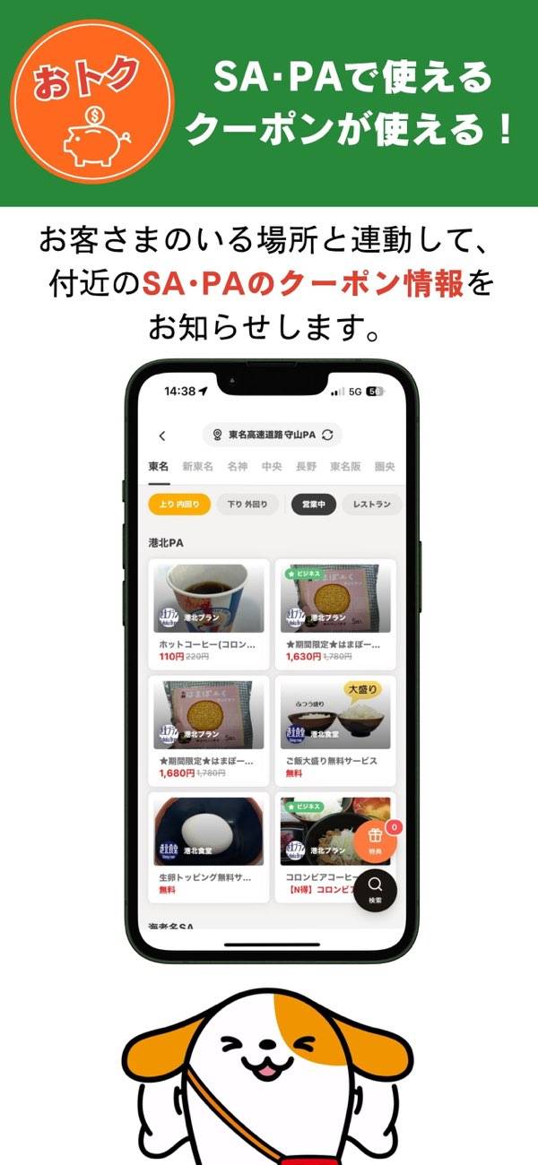 - エリア限定クーポンが豊富。SAの人気グルメも割引で楽しめる