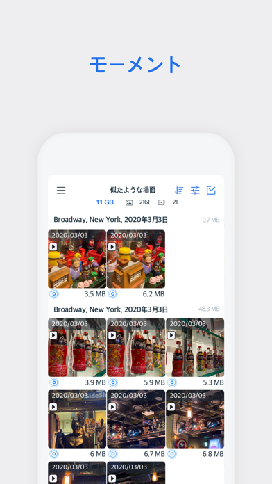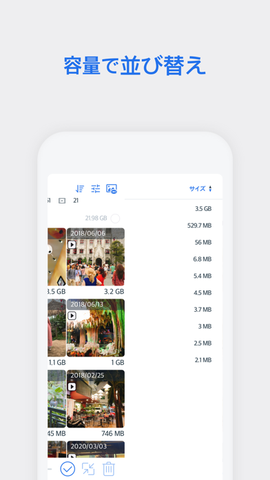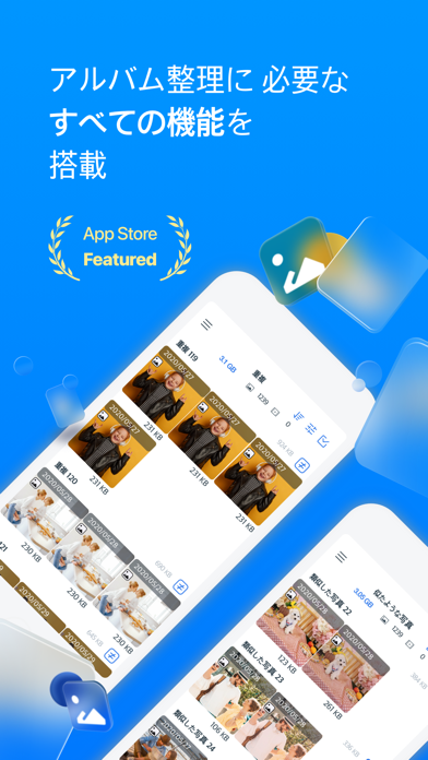 スマホの写真や動画を削除できるクリーニングツールです。重複した写真を検索したり、容量の大きいデータ順に並べ替えたりして、効率的な写真整理が可能。
