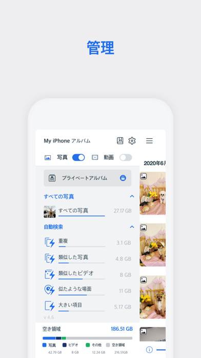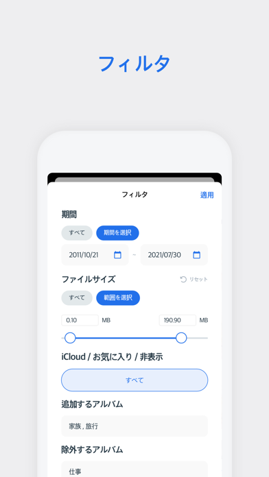 - 日付・サイズでのフィルタ検索や、重複写真の表示機能なども搭載