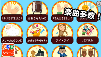 さまざまな楽曲に合わせて画面をタップすると、楽器音が鳴る知育アプリです。「アンパンマンのマーチ」や「おもちゃのチャチャチャ」など、収録楽曲のジャンルが幅広いのも嬉しいポイント。制限時間などもないため、手軽に音の違いを学べますよ。