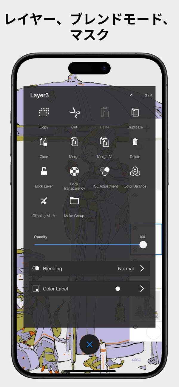 複数のレイヤーで深みのある効果や質感を表現。修正や変更もレイヤー単位で行えるため、安心して作業を進められます。カットやコピー、レイヤーの結合もワンタップで行えます。