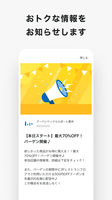 指定したららぽーとの店舗やキャンペーンなどの情報をGETできます。せっかく行ったのにお目当てのお店がないなんてことはなくなります。普段よくいくららぽーとがあれば、登録しておきましょう。