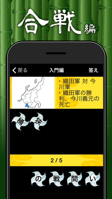 戦国武将だけでなく旧国名や合戦、城名にも対応しています。戦国時代の重要項目ならこれひとつでOK。文字パネルをタップで並べて解答していくシンプルな操作です。モードは並べ替えるだけの「易モード」と、お邪魔パネルも混入する「難モード」の2種類。まずは易モードで理解を深め、難モードで定着させるのがおすすめです。