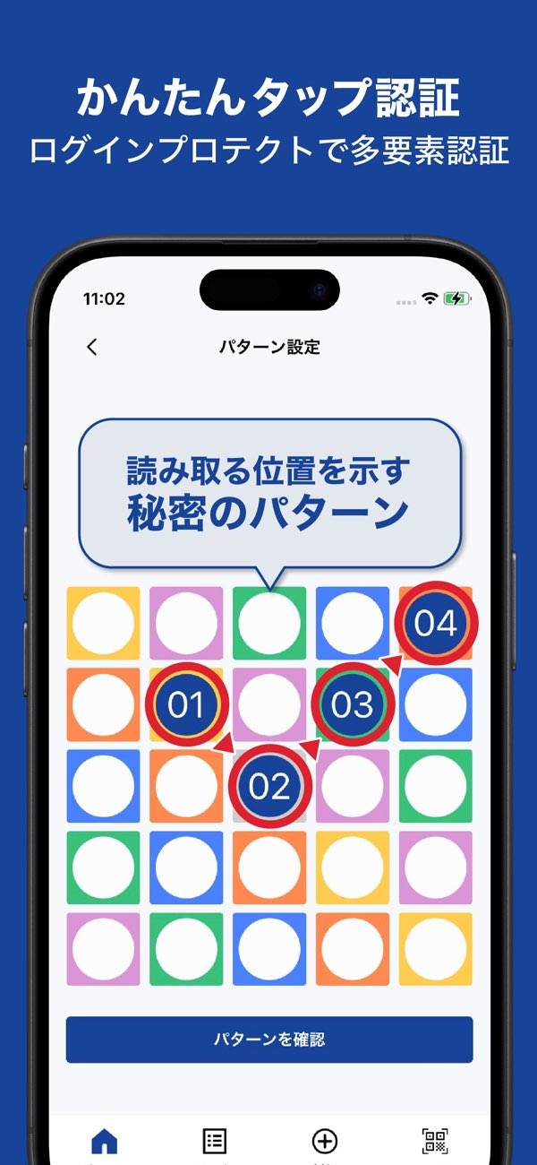 特定の「パターン」を覚えるだけですべてのパスワードを管理します。「パターン」は5×5のマトリクス(暗号表)上に表示され、見られてもパスワードは特定されにくいです。複雑なパスワードを覚える手間を省き、安全性を高めてくれます。