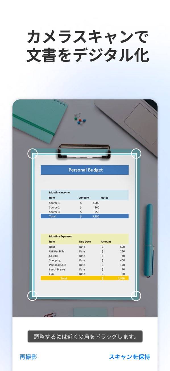 どうしてもPDF化したい場合は、カメラで撮影するのがおすすめ。撮影した写真や文書の必要な部分だけ切り取ってデータ化できます。ほかのメンバーに共有したいときに活用してみてください。