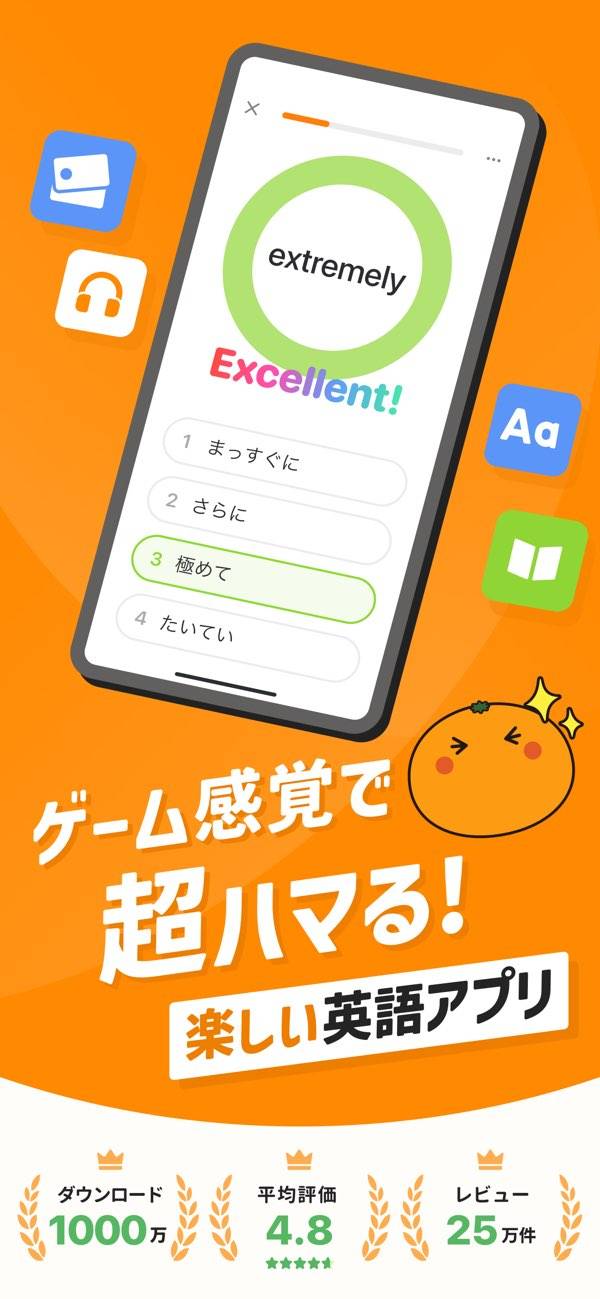 英語学習アプリ。ゲーム感覚で単語を学習できます。プッシュ通知を許可して使用しているのですがいい意味で割としつこく「勉強の時間だよ」とか「アプリ開いてみない?」などとかわいいみかんのキャラクターが誘ってきます。軽い気持ちで始められるので飽きっぽい私が続いています。