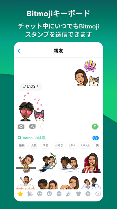 作ったアバターでスタンプを自動生成してくれます。本アプリをキーボード登録すると、スタンプをほかのアプリで利用可能。自分そっくりのアバタースタンプで、友だちをびっくりさせちゃいましょう。