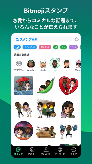 自分に似せて作ったアバターでスタンプがいろいろな所に貼れて楽しいです!キーボードに設定すると、わざわざアプリを開かなくてもすぐスタンプを選択出来てコピーしてくれるので、SNSとかにそのまま貼り付けるだけです。パーツ選びがもっと種類が増えたら良いな。