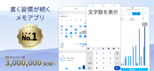 自動の文字数カウントと色分け保存が魅力のメモアプリ。特に文字数が重要な文書作成時に活躍します。またパスロック機能でプライバシーも守られ、安心して用途に合わせて使えるから、学生からビジネスパーソンまで幅広くおすすめです。