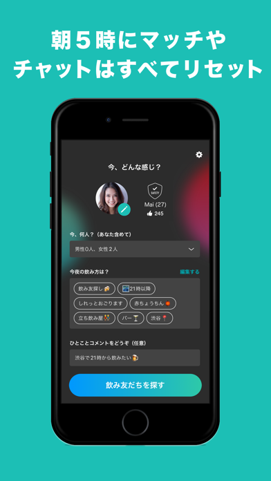 - 性別・年齢・距離など、一緒に飲みたい人の条件を選択して探せる