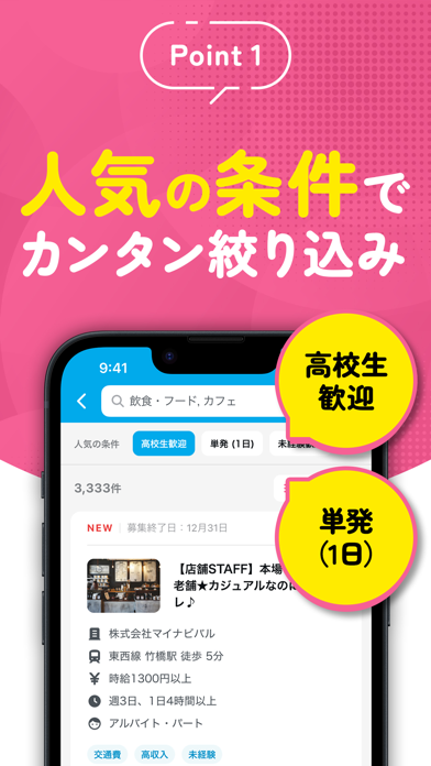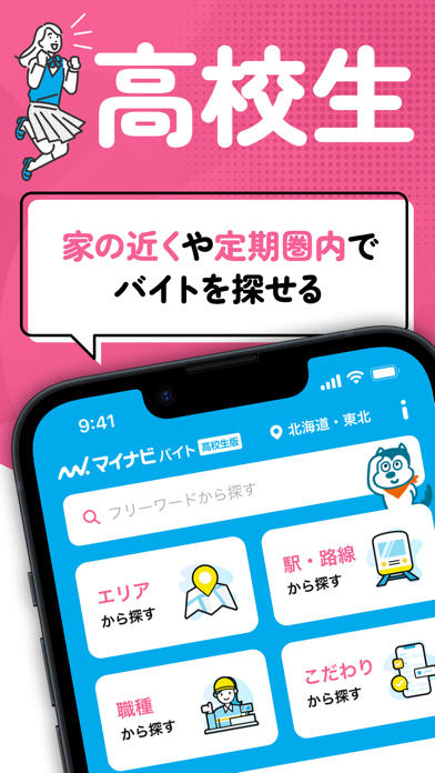 高校生に最適なバイト探しをサポートする求人アプリ。全国の求人情報から通学定期の範囲内や単発の仕事を瞬時に検索。一日だけのバイトから、定期券範囲内の仕事まで、あなたのライフスタイルに合うバイトがきっと見つかります。初めてのバイト探しでも安心、「まなび」機能でバイトの基礎知識も身につきますよ。