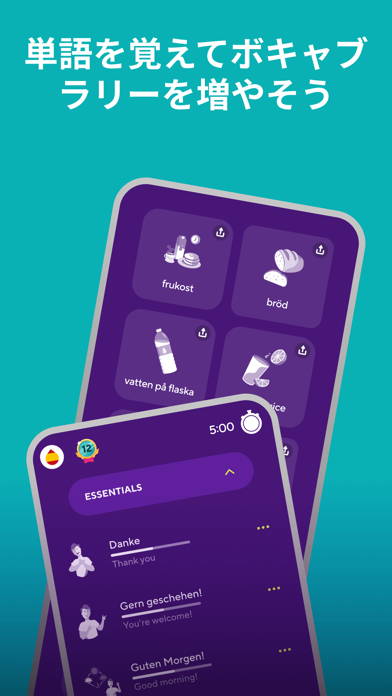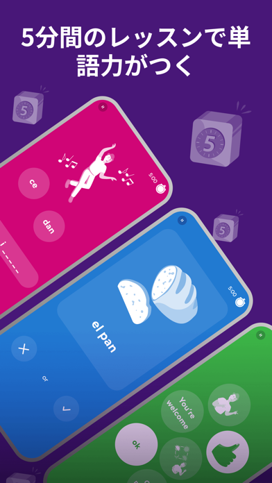 ゲーム感覚で単語を覚えられます。単語に合致した絵を選んだり、単語を正しく並べ替えたりするうちに自然と単語を習得。最低学習時間の5分があっという間に感じるでしょう。
