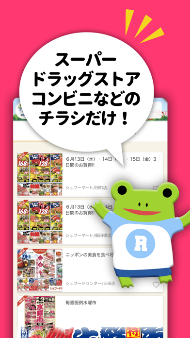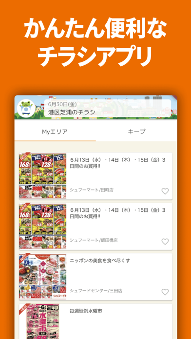 近所のスーパーやドラッグストアなどのチラシを見れるアプリで一度にチラシを見られるのでとても便利です。今まではわざわざお店のホームぺージを開いてからチラシを見ていましたが面倒だなと思っていたらこのアプリに出会いました。特売情報などもチェックできるので計画的に買い物できます。近所のお店だけでなく遠くのお店のチラシも見れるので良いです。ハートマークをタップすればキープタグに保存され後で見たい時にわざわざ検索する必要がなくて便利です