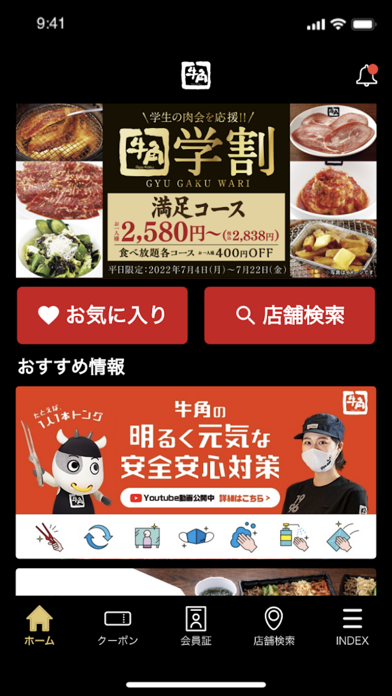 - キャンペーンや食べ放題の情報が載った「牛角」公式アプリ