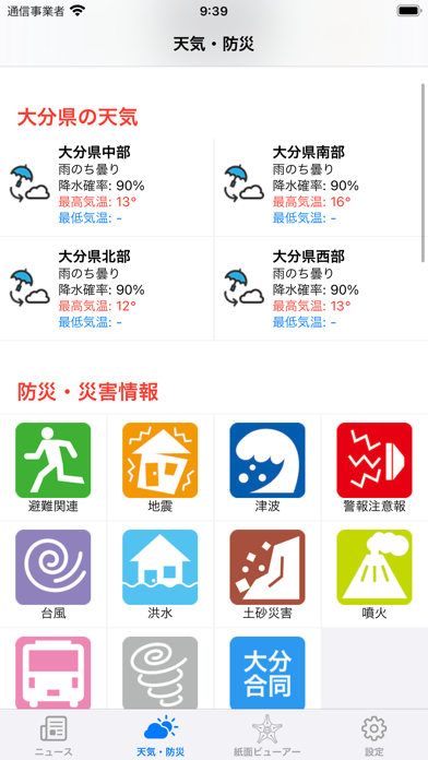 大分県内をエリア別に天気予報を確認できます。あわせて地震や台風、警報・注意報などの防災・災害情報も掲載。避難に関する情報や、交通、災害時に役立つ通信手段、ライフライン関連も一緒に見られるため、チェックしておけばもし災害が起きても慌てず行動しやすいです。