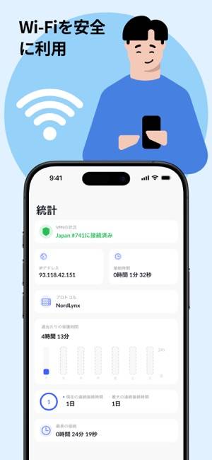 接続の状況や保護時間などをモニタリングできます。いつでも正確な通信状態を把握しておけるので、安心です。自分がどれだけネットを使っているかも把握できるので、スマホの使い過ぎのチェックも可能。
