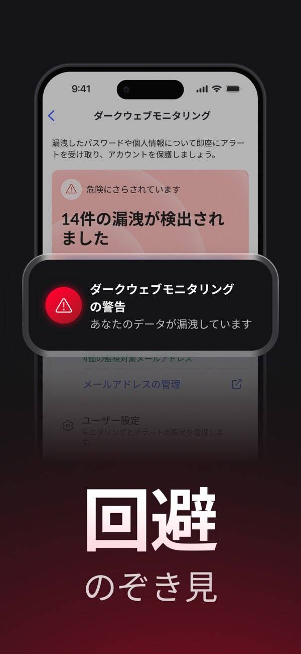 この機能は、頻繁にダークウェブのページをスキャンし、ユーザーさんのメールアドレスに紐づく認証情報を探し、危険が検出された場合は即座に通知します。