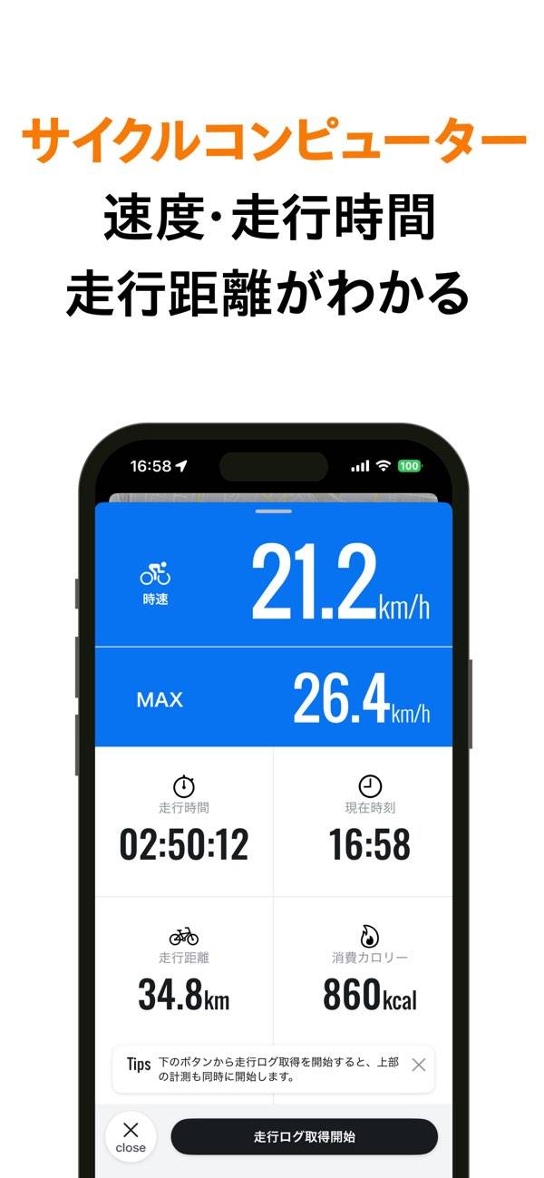 道や施設の位置がわかる地図と、自転車の走行記録機能を併用できるアプリ。目的地までのルートを案内してもらいながら、日々のサイクリングを楽しめます。