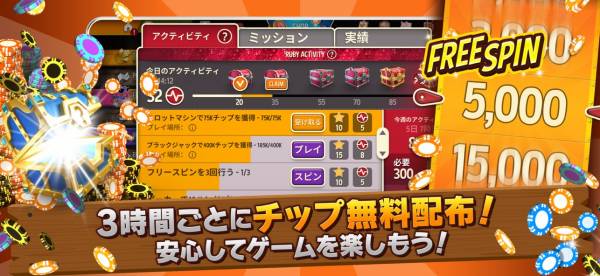 - 3時間ごとに無料チップを獲得できて、長く遊べる