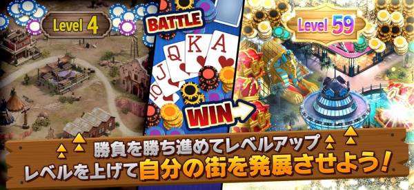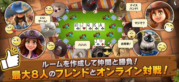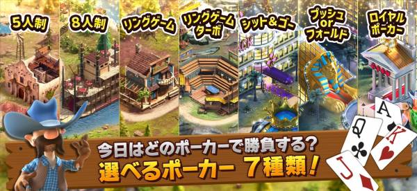 ウェスタン風の陽気な世界で、テキサスホールデムをはじめさまざまなカジノゲームを楽しめるカードアプリ。トランプを使ったポーカーやブラックジャックが中心で、短時間勝負のトーナメントも豊富です。無課金でもチップが手に入るので、時間があるときに気軽に遊びやすいのが魅力です。