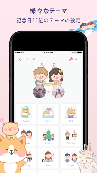 本アプリの「テーマ」とは、ふたりの名前表示に付けられるエフェクトのことです。給料日や旅行などの日常使いできるテーマから、結婚記念日などの特別なイベントに使えるテーマがラインナップ。ふたりの記念日を自由に彩ってみませんか。