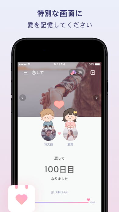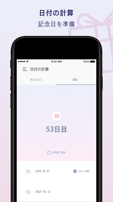 記念日からの経過日数をひと目でチェックできます。100日や1年などの区切りの良い日付を設定しておくことで、プッシュ通知でお知らせ。記念日を複数登録しておけば、スワイプ操作で切り替えが可能です。