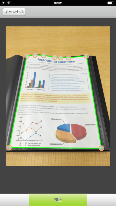 カメラで書類を撮影すると自動で補正してくれます。書類の縁を認識し、トリミング・台形補正が行われるので、無駄な余白がなく画面ピッタリに取り込むことが可能。また、少し斜めから撮った場合でも正面向きに補正してくれるので、とても見やすくなりますよ。