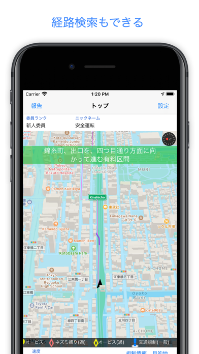 近くで行われているネズミ捕りや、設置されているオービスをマップに表示。取り締まりに引っかかる危険を回避しながら、目的地までのルートを決められます。また自分から取り締まりの情報を報告することもできます。