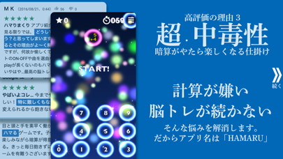 一見すると単純な計算ゲームですが、中毒になる要素が豊富にある脳トレアプリ。本アプリには制限時間があるのでスピードも重要。アップテンポなBGMに合わせて遊べば、いつのまにか夢中になってしまいます。あなたもリズムにノリながら、レッツ脳トレ!