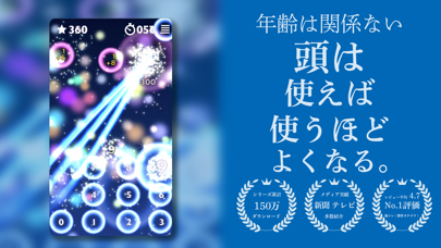 時間内に上から落ちてくる計算問題を解いていく脳トレゲーム。派手で綺麗なエフェクトと、綺麗なテクノミュージックが特徴。ミュージックはいくつかある中で自分の好みの物を選択できます。難しい操作も無く、数字の入力ボタンと計算式をタップするだけ。少しの空き時間でできるので入れて損なしです。