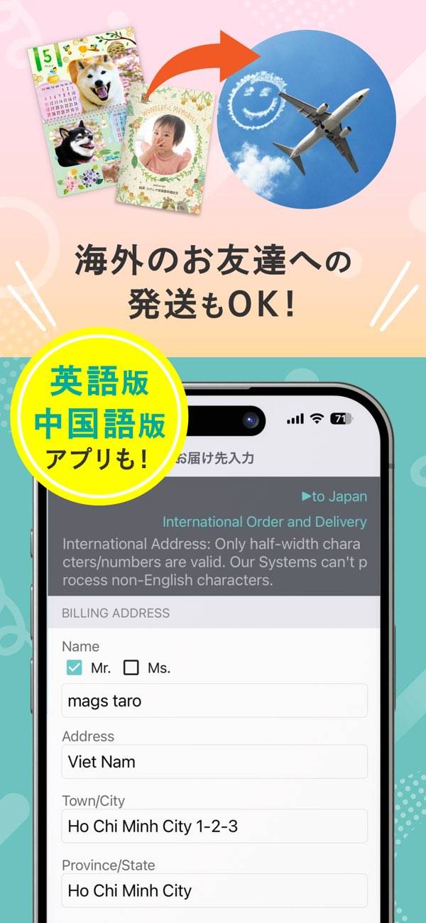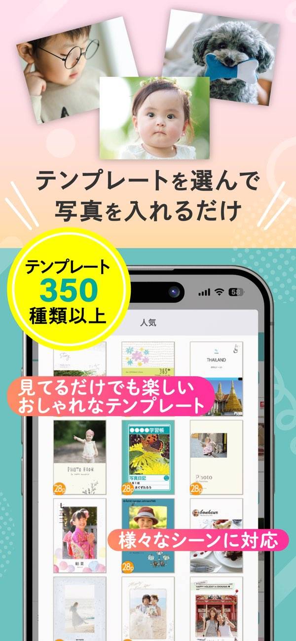 | 収納写真上限 | テンプレートによって上限枚数が異なり、テンプレートの数が200種類以上ある |