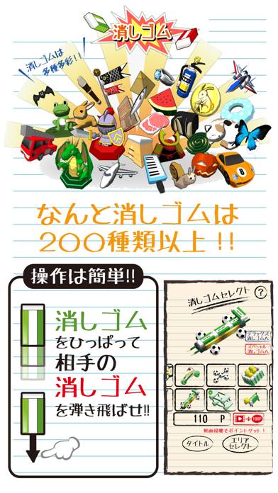消しゴムを弾いて、相手の消しゴムを机から落とすシンプルなゲーム。画面を引っ張って消しゴムを弾く力を調節し、相手の消しゴムを落とせば勝利となります。簡単で手軽ながら、つい夢中になってしまうこと間違いなしです。