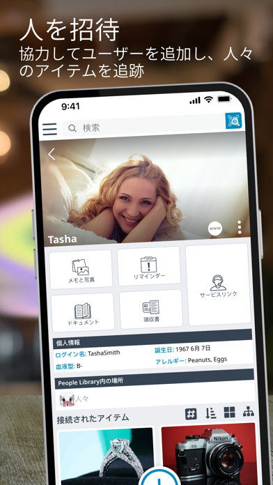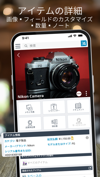 所持品から人や組織の情報まで一元管理できる多機能ツールです。家電や衣服などに名前や写真をつけて、アイテムとして登録。メーカーをはじめとした詳細情報の入力はもちろん、領収書の画像やPDFの添付も可能です。さらに家族や友人、頻繁に利用するサイトや店まで、幅広い情報をまとめて管理できます。