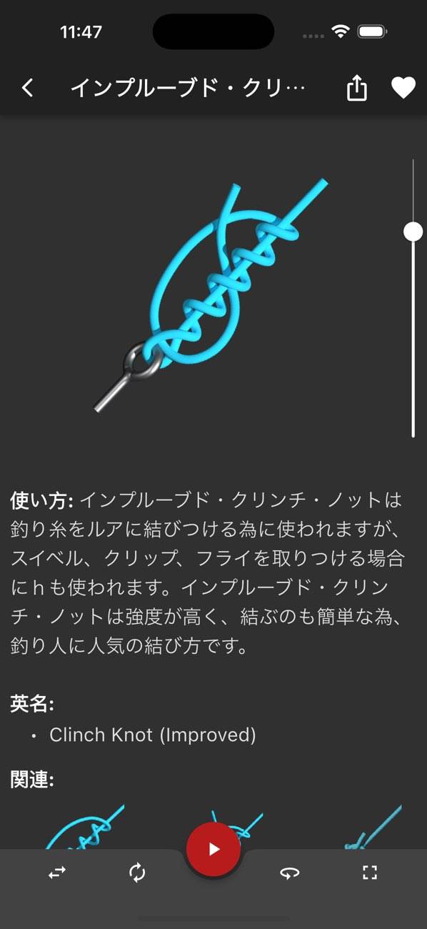 全方向から見られる3Dアニメーションで、ロープを結ぶ手順を解説。文章では結び方がよくわからないという人も、映像であれば手順を把握しやすいでしょう。速度の調整もできるため、ついていけなくなることもありません。