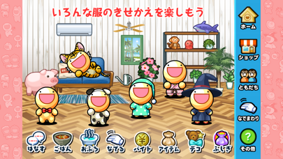 バイトで稼いだお金で、インテリアや服を購入。お姫様風やうさ耳など、ふにゃもらけをいろんな姿に着せかえて遊べますよ。家具を購入すればするほど店のレベルも上がり、買えるものが増えていきます。