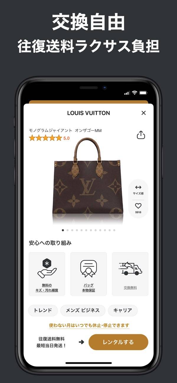 高級ブランドバッグをレンタルできるアプリです。60以上の有名ブランドから自由に選び、使ってから購入を考えられるのがポイント。自宅でゆっくり試せるから、お店の短時間ではわからない「重さ」や「使いやすさ」までしっかり確認できます。