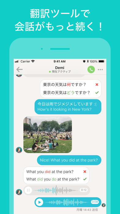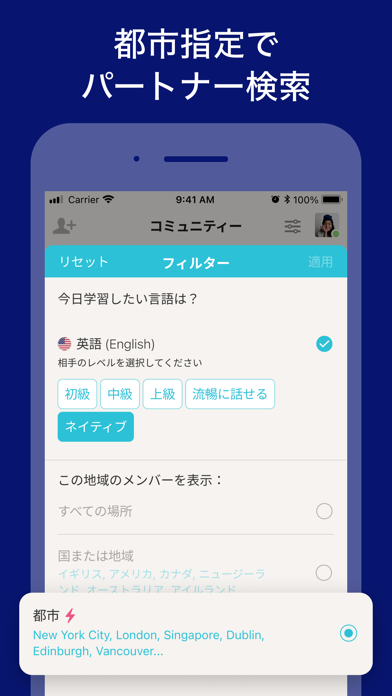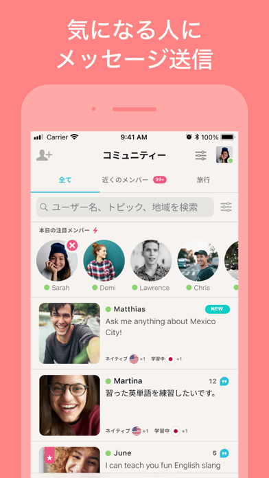 - 語学を勉強している世界中のユーザー同士で、通話やチャットができる