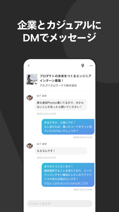 就活生とインターンシップ先をつなげるビジネス系マッチングアプリです。あなたが希望する業界、企業の情報を手に入れられるので、社会人になる前の大切なステップをサポートしてくれます。さまざまな企業のビジョンや働く環境を理解し、最適なキャリアパスを見つける学生にぴったり。