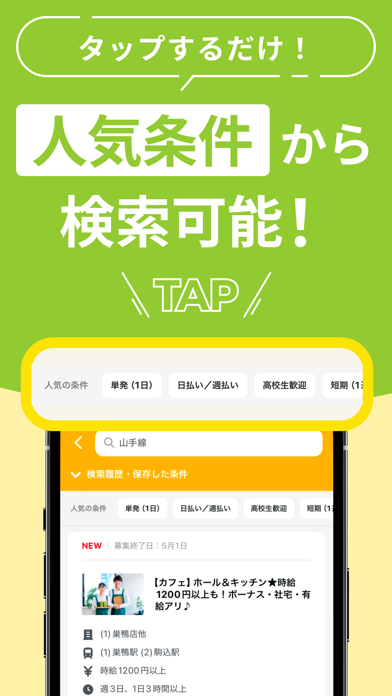 求人の一覧が表示されるので、気になった求人の情報を確認してみましょう。追加で単発や週払いなどの条件を追加することもできます。