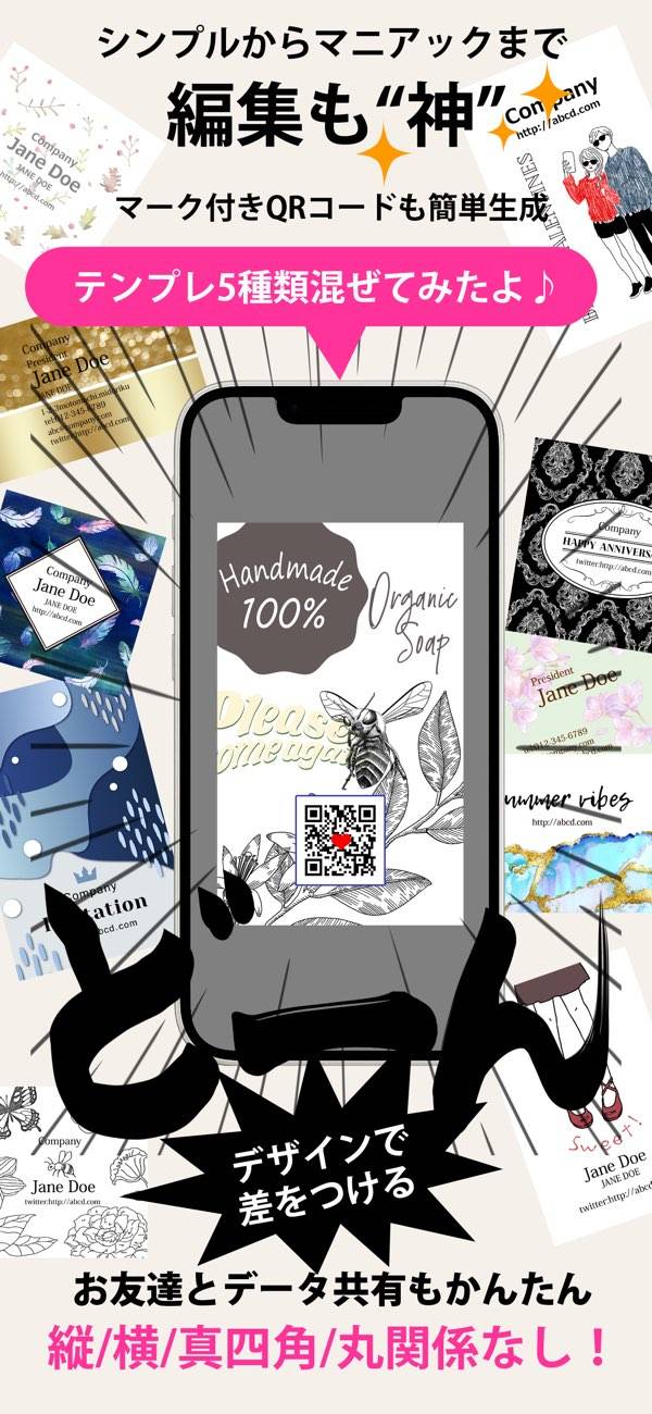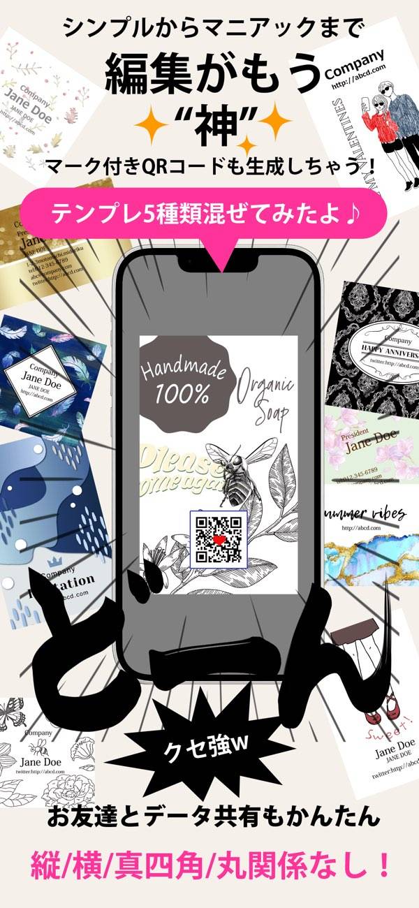 シンプルかつおしゃれな名刺が作れるアプリです。たくさんのお洒落名刺のテンプレートが用意されているので、選んでプロフィールを入力するだけでOK。キレイにレイアウトしてくれるので加工する必要がほぼありません。もちろん自分でいちから作ることも可能ですよ。