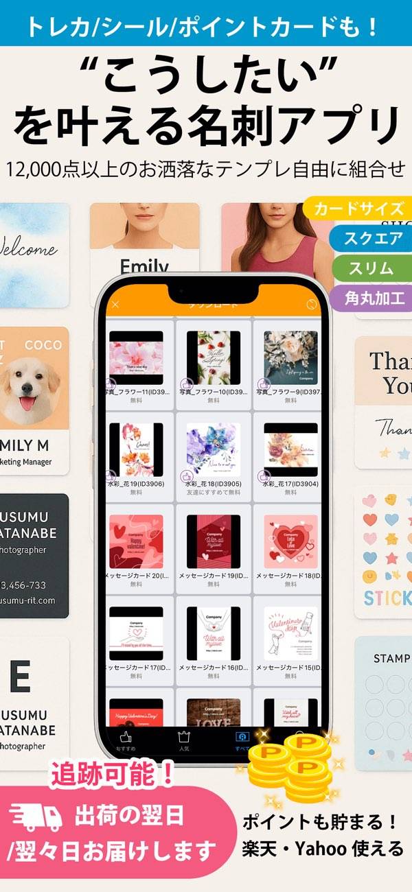 名刺作成アプリの中で一番よかったです!自由度も凄くて、とにかくオリジナルが安く作れますね。そしてそもそも悪いレビューがない。届いた名刺もとっても高級感あってよかったですし、デザインもとてもお洒落で豊富。名刺だけでなく、ポイントカードやショップカードなど何でも作れます。コスプレ名刺も。。。また紙の厚さも選べるのでGOODです。