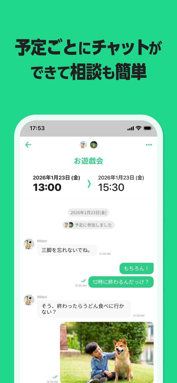 - 予定ごとにチャットができ、変更や集合場所のやりとりがアプリ内で完結