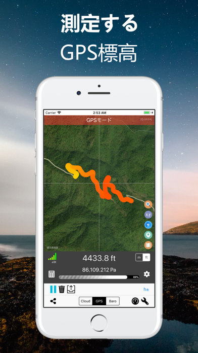 画面下部の「GPS」ボタンから、自動追跡ができるようになります。地図上にピンを立てる動作を省き、リアルタイムで現在地の高度と気圧が把握可能に。バッテリーの消耗は激しいものの、ハイキングのときなどに活躍してくれる機能です。
