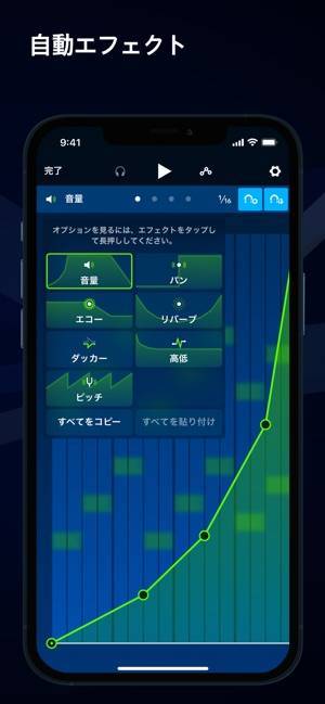 打ち込みが終わったら、画面上の再生ボタンをタップすると、すべてのパートの音を重ねて同時に再生します。どんな曲に仕上がっているかを確認しましょう。OKであれば、左上の「完了」ボタンで保存できます。