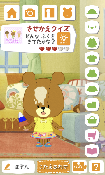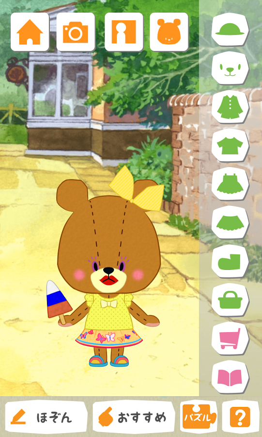 画面右側のアイコンをタップすると、様々なアイテムが出てきます。あとはそのアイテムをルルロロのところまでスワイプするだけ! これで着せ替えることができますよ。