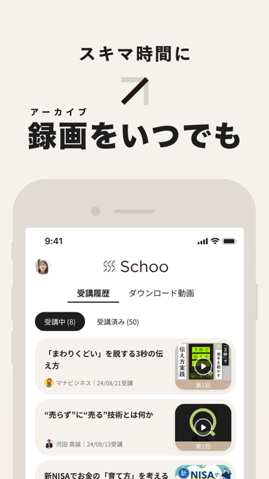 オンラインでいろいろな講座を受講できるSchoo(スクー)というサイトのアプリ版です。アプリならどこでも受講可能。講座も様々なジャンルがあります。