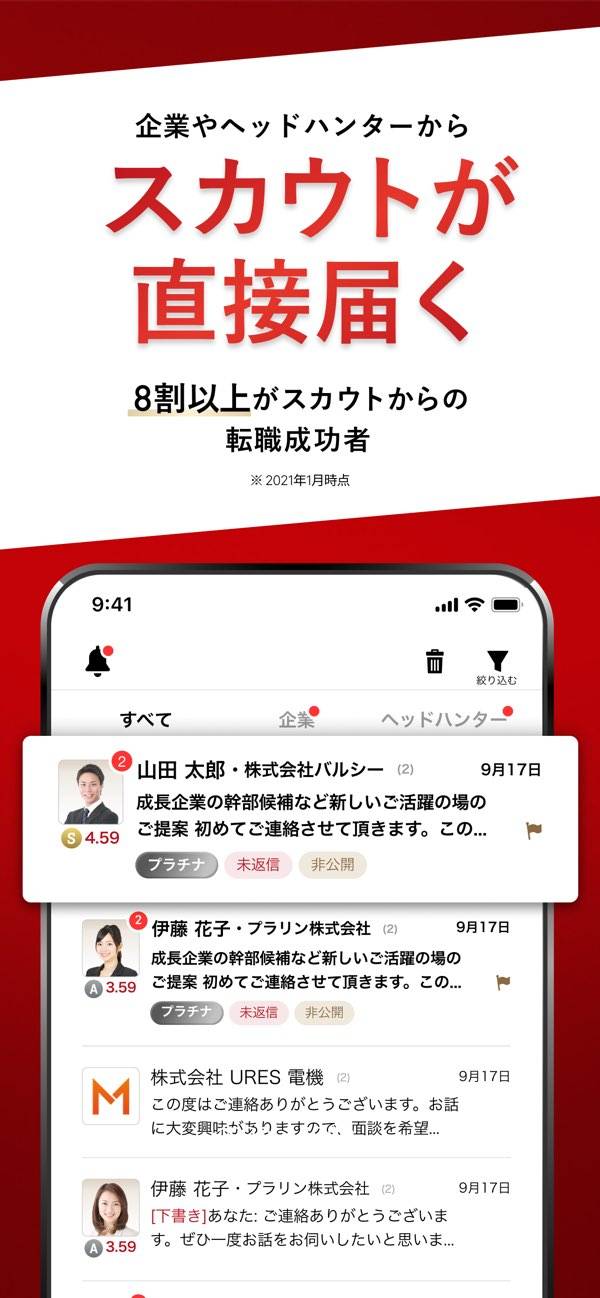 - 登録するだけで高年収・大手企業から直接スカウトが届く