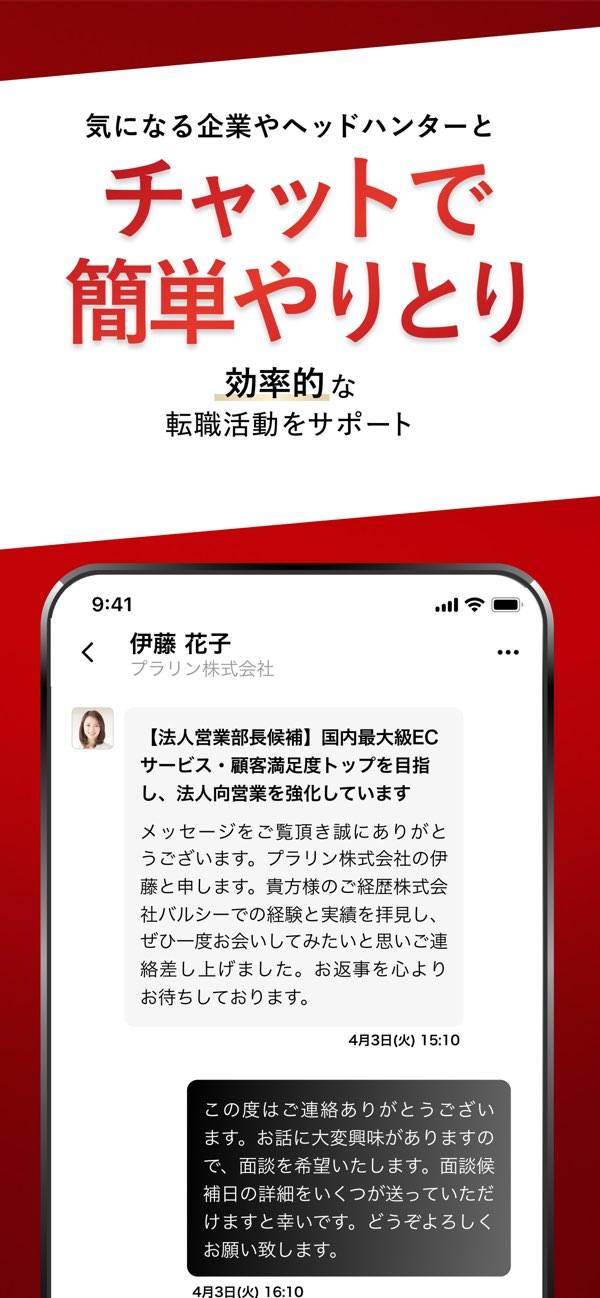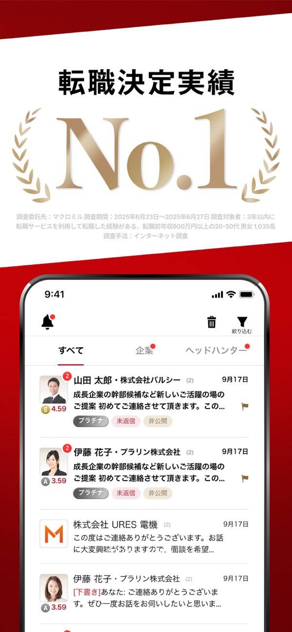 忙しい日々の中でも、効率よくハイクラスな仕事探しが進められる転職アプリ。登録情報をもとにした求人のおすすめや、企業・ヘッドハンターからの直接スカウトが届きやすいのが特長。気になる案件だけをピックアップできるから、現職を続けながらでも無駄なく活動できます。