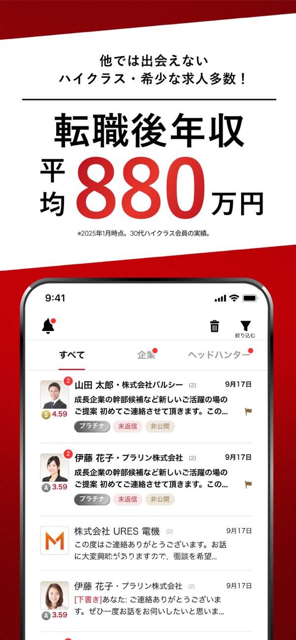 忙しい日々の中でも、効率よくハイクラスな仕事探しが進められる転職アプリ。登録情報をもとにした求人のおすすめや、企業・ヘッドハンターからの直接スカウトが届きやすいのが特長。気になる案件だけをピックアップできるから、現職を続けながらでも無駄なく活動できます。